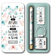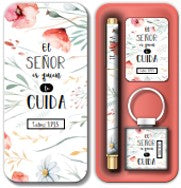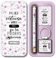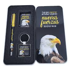 -Hermosa presentación de productos en cajita de metal: bolígrafo, llavero y tarjeta coordinada con texto bíblico. Modelos para damas y caballeros.
