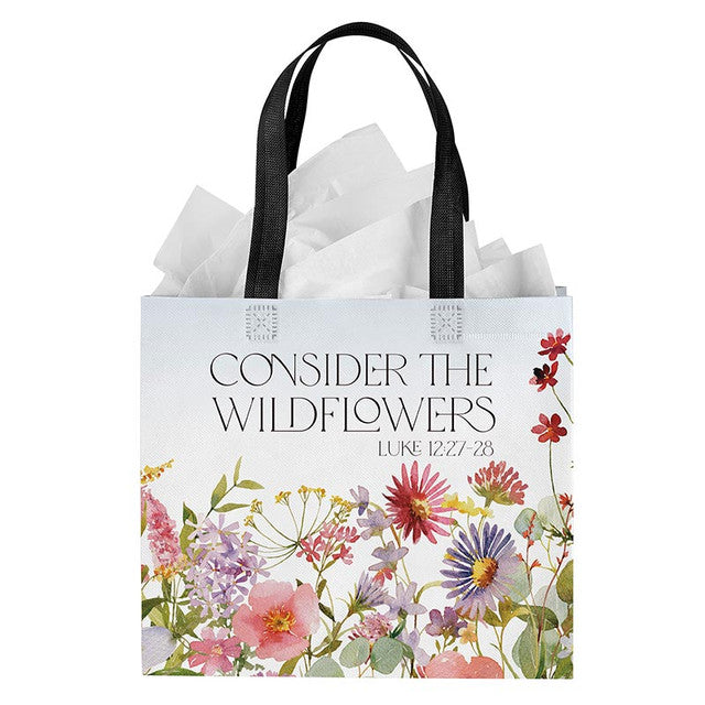 - Bolsa reusable con diseños a color de gran capacidad. Medida 12"x 11" con mango de 4". Texto en ingls de Lucas 12:27-28.